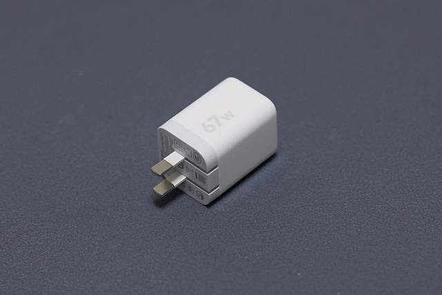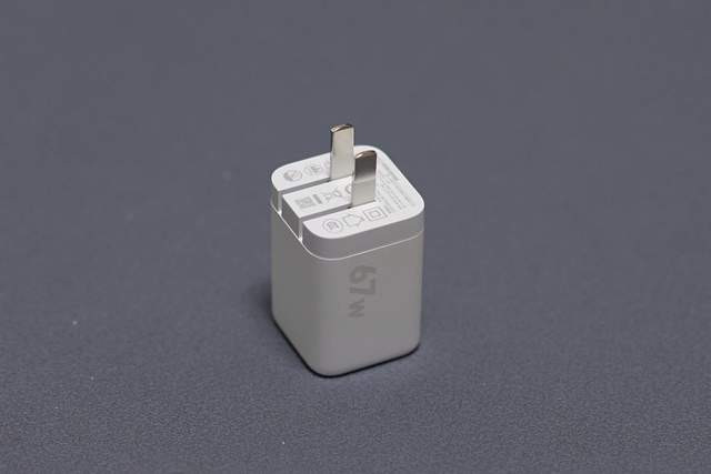 这款充电器机身尺寸仅47×35×33mm,体积仅有54.3cm³,比同规格的67W快充头体积小了2/3,真正做到了糖果般大小。
