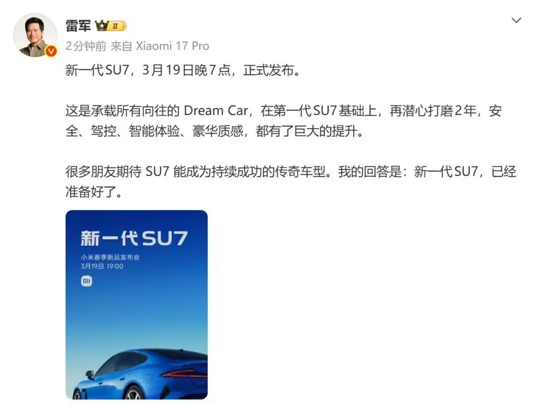 胜宇配资APP下载 雷军官宣小米新品发布会:新一代SU7,3月19日正式发布,安全、驾控、智能体验、豪华质感,都有了巨大的提升 胜宇配资APP下载 来源:长春配资官网 网站:盈胜优配 日期:2026-03-16 20:32:43 查看:191