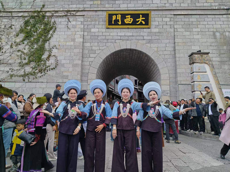 夜幕降临,灯火阑珊处。身着苗族盛装的姑娘们沿古老的街巷款款而行,银饰与灯光交相辉映,叮当作响,宛如移动的星河;布依族精美的刺绣服饰在夜色中绽放出绚丽的光彩……古城仿佛变成一个展示中华民族服饰文化的流动博物馆。光滑的石板路,化作连接历史与当代的时光纽带。